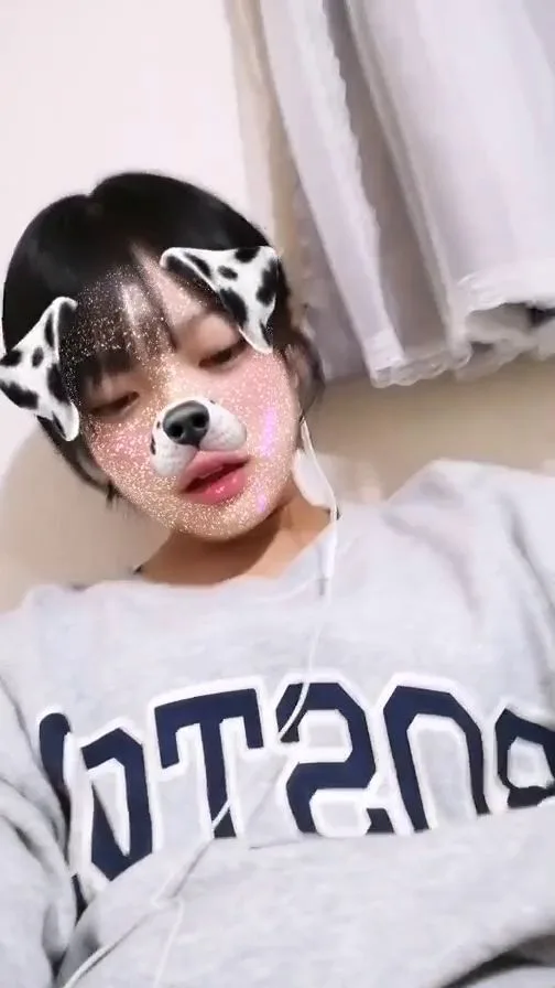 Watch an Asian girl with short black hair take intimate selfies with a dog filter, wearing a gray sweatshirt and white earbuds, in a cozy bedroom or living room.