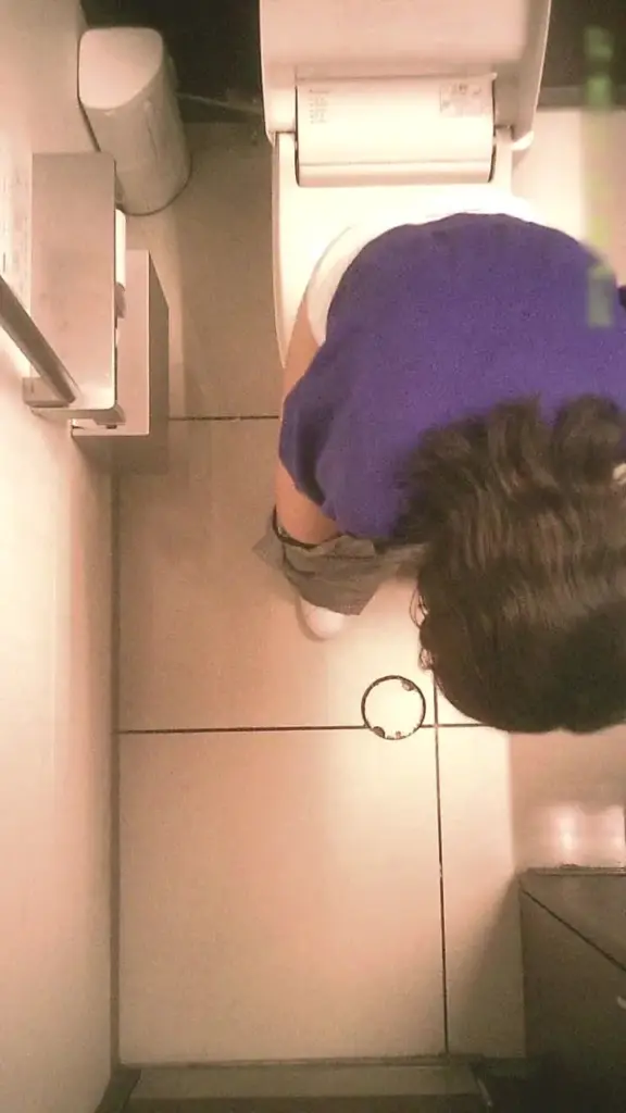 Watch a slim Asian girl with long brown hair urinate in a bathroom. POV and wide shots capture the intimate moment.