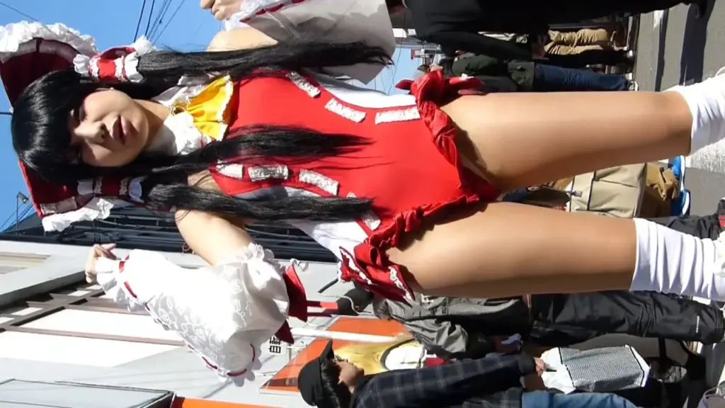 Watch an Asian girl with braids and a tattoo posing outdoors in a red and white costume.