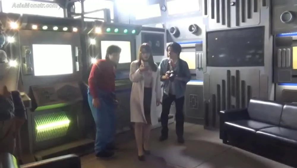 Watch an Asian girl in glasses and lab coat with two muscular Asian men in a futuristic setting