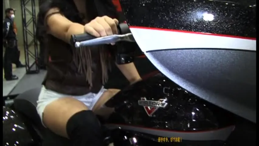 Watch a young Asian woman with long black hair posing with motorcycles in an exhibition hall, showcasing her slim figure and tattoos.