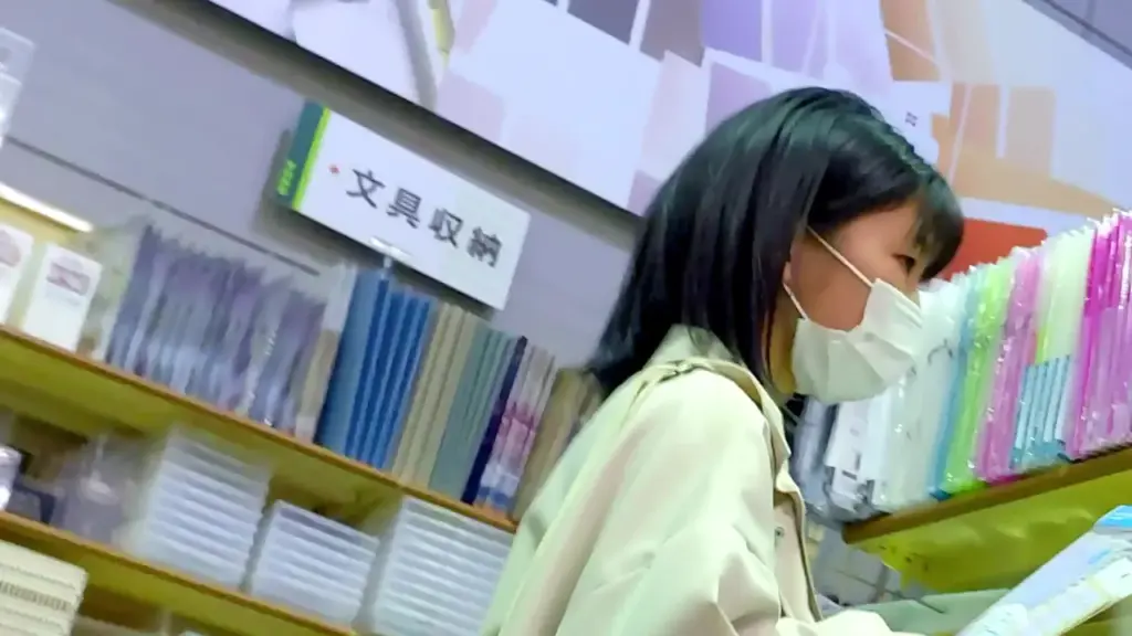 Watch an Asian girl with gray hair and tattoos bending over in a store and on a conveyor belt in a warehouse