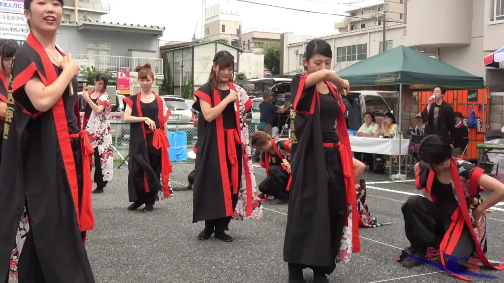 Watch a group of Asian girls perform a choreographed dance on the street, dressed in black and red outfits, using wooden clappers.
