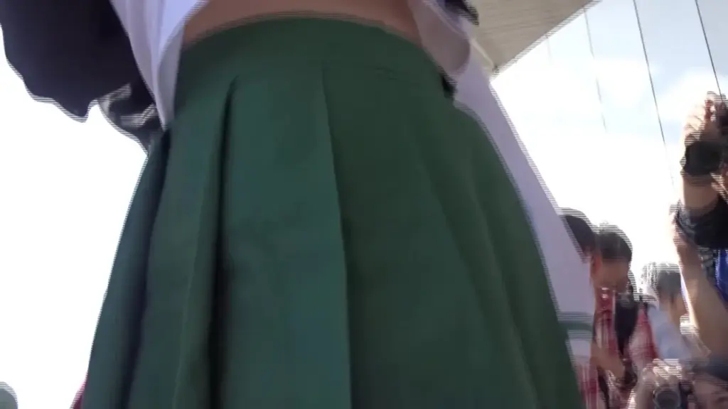 Watch slim Asian girls in green skirts and white shirts tease with lifted skirts at an outdoor event