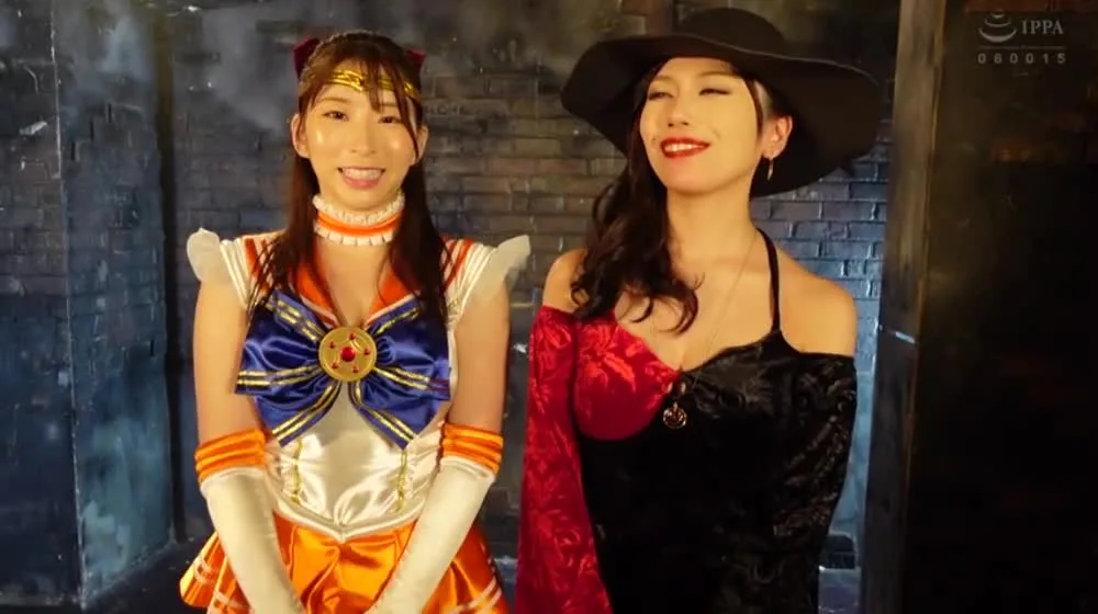 Watch two Asian girls with red ribbons and black hats standing together in a dark, abandoned room