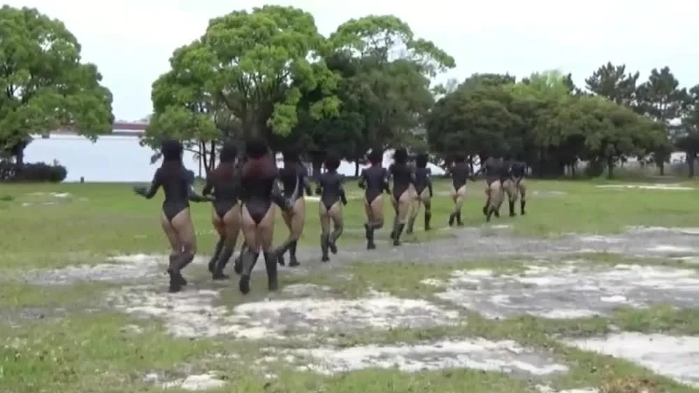 Watch a group of young Asian women in black bodysuits enjoying an outdoor adventure, from running in formation to playful moments in a park.