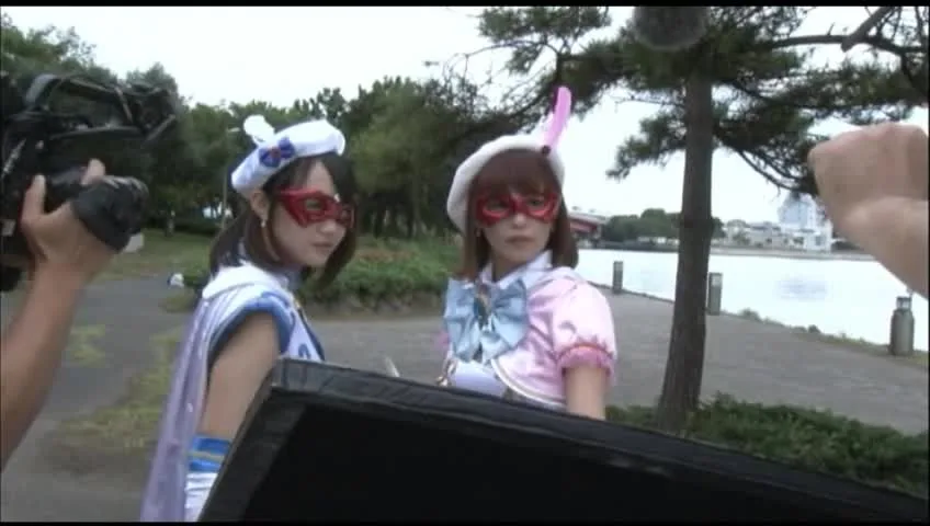 Watch two Asian girls posing in colorful costumes and hats by the waterfront, with a mix of playful and seductive moments.