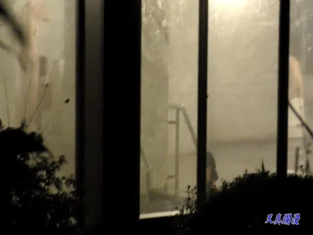 Watch Asian girls standing in a dimly lit bathroom, captured through glass in various shots.