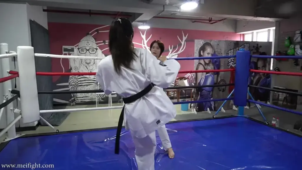 Watch two Asian girls engage in intense martial arts training in a gym with a boxing ring and blue mats.