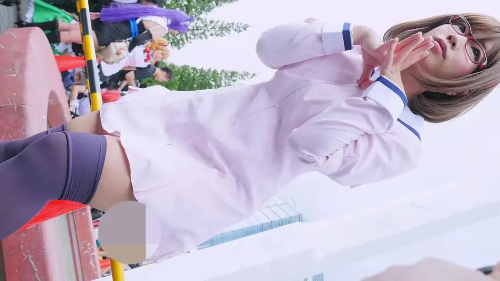 Watch two Asian girls in their 20s undress and pose at an outdoor market or festival, captured in natural light.