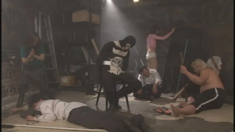Watch a group of Asian girls with white boots and muscular men in a basement setting with shelves and ladders. Explicit content.