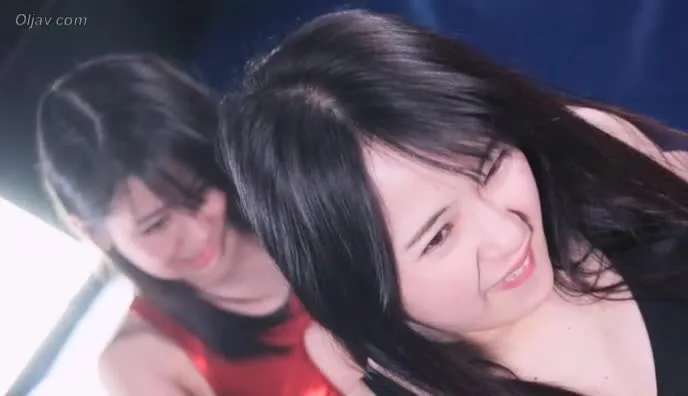 Watch two slim Asian girls engage in an intense wrestling match wearing red and black swimsuits under spotlights