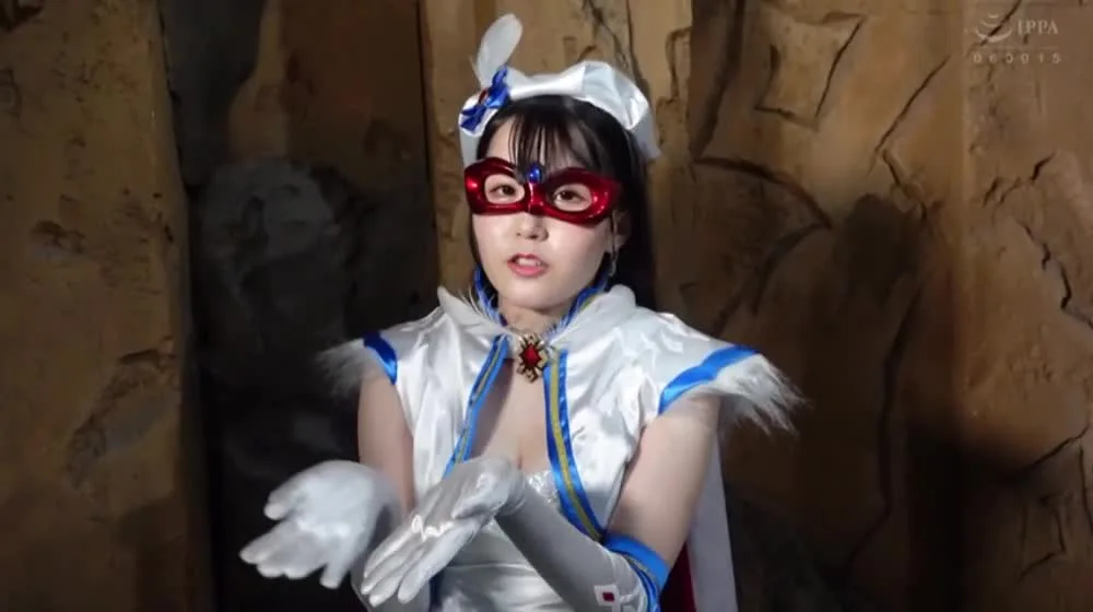 Watch a stunning Asian performer dressed in a white and blue costume, posing in an ancient temple setting with intricate carvings and stone pillars.