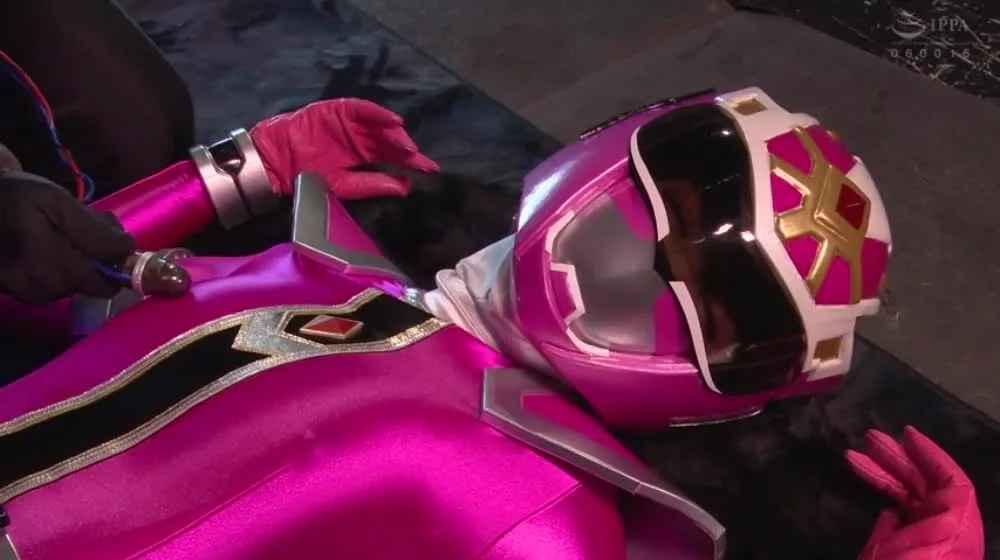 Watch an Asian performer dressed as Pink Power Ranger in various seductive poses and actions, captured in different camera angles and lighting.