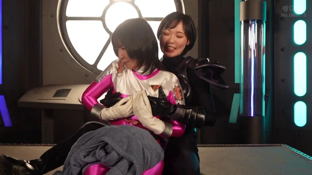 Watch two Asian women in costumes engage in intimate moments in a futuristic room with sleek decor and bright lighting