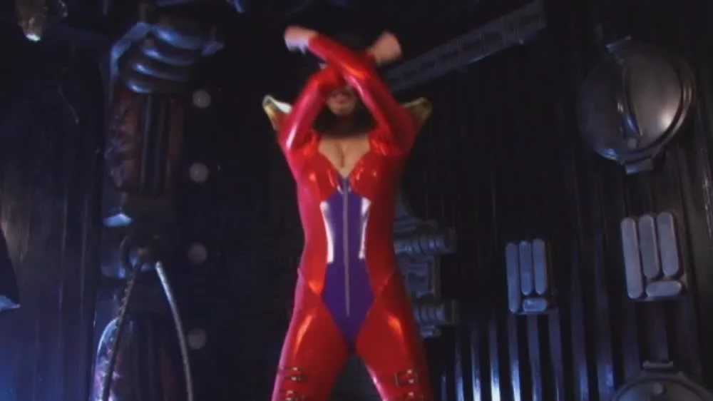 Explore the seductive world of Asian beauties in metallic clothing and masks, engaging in intimate moments in a dark, dimly lit setting.
