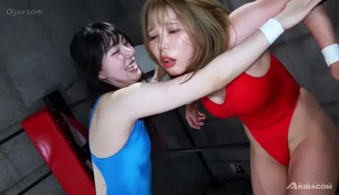 Watch three Asian women engage in a fierce wrestling match in a brightly lit ring, wearing white wristbands and athletic attire.