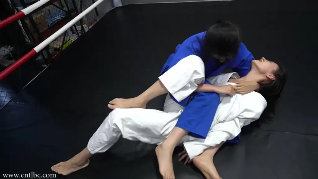 Watch two Asian women engage in intense grappling match in judogi at a martial arts gym, captured in high angle medium shots.