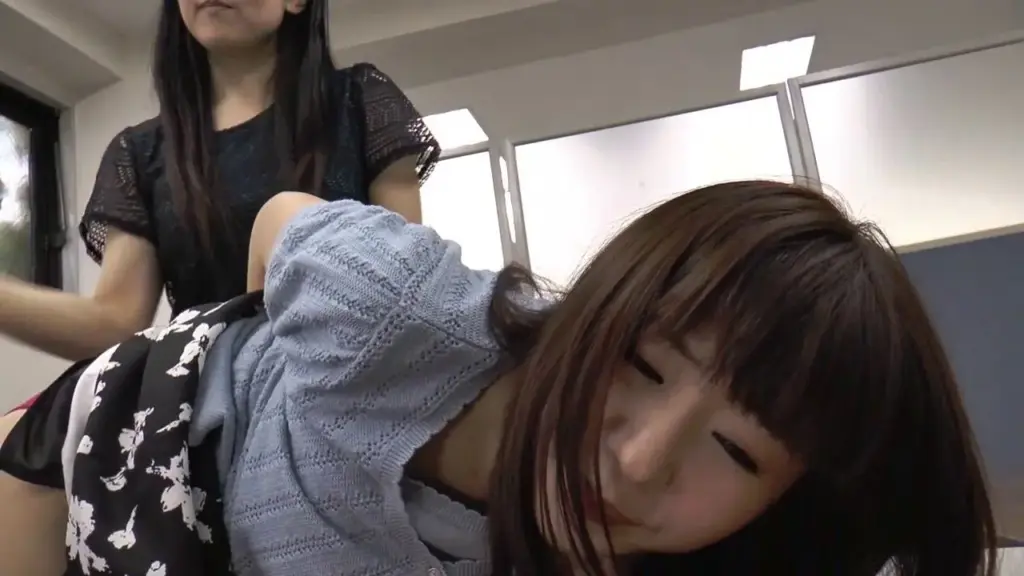 Watch two slender Asian lesbians engage in a spanking session in a fluorescent-lit office setting, captured in various camera angles.