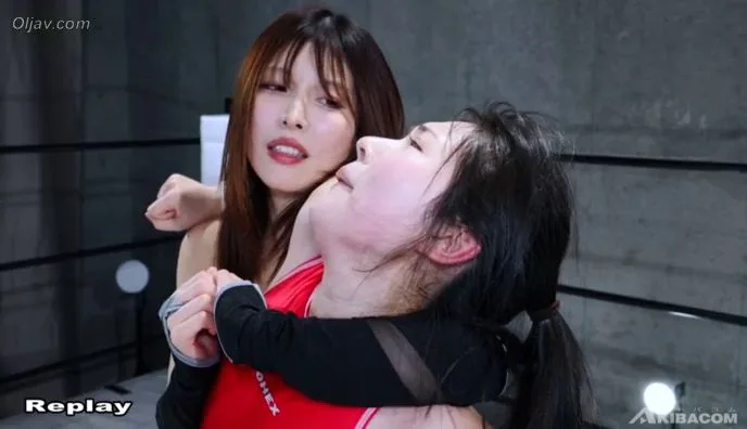 Watch two slim Asian women with dark brown hair engage in intimate wrestling and grappling, wearing black bodysuits and red lipstick.