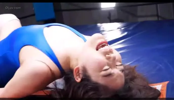 Watch two Asian women engage in intense wrestling match, wearing blue and red leotards, in a dimly lit wrestling ring.