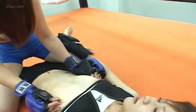 Watch two Asian women engage in a sensual wrestling match in a martial arts ring, captured in high angle medium shots.