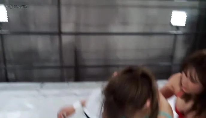 Watch two Asian women engage in intense wrestling match, choking and grappling in a wrestling ring, wearing sports attire.