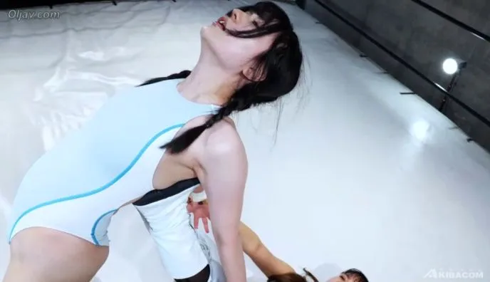 Watch two slim Asian women in wrestling attire grapple on a mat in a studio setting, captured in various camera angles.