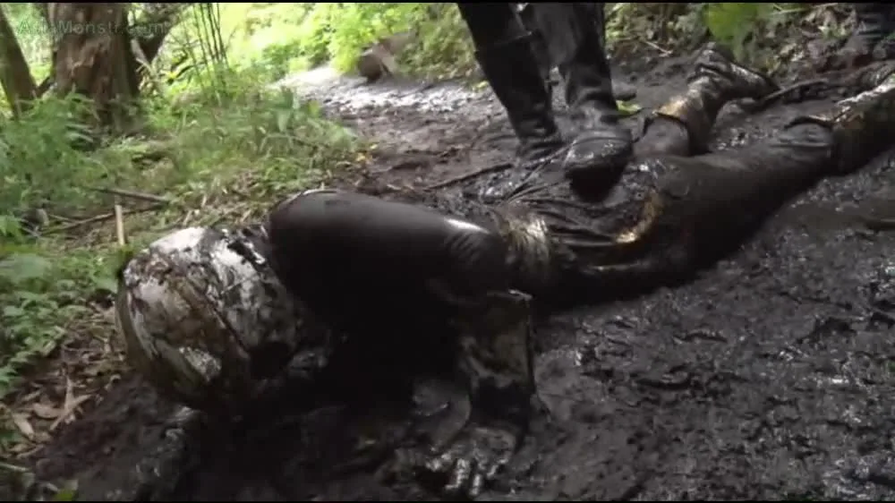 Watch two Asian men in costume engage in an intense outdoor encounter in a forest setting, with mud and costumes adding to the intensity