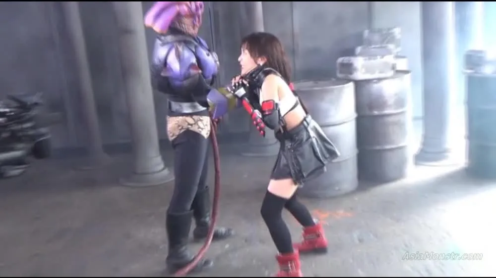Watch a slim Asian model in her 20s with long brown hair, wearing a black skirt and red boots, posing with various props in an industrial setting.
