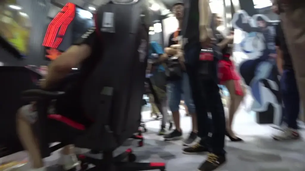 Watch Asian models walking around an exhibition, some in revealing outfits, others near gaming areas with large screens