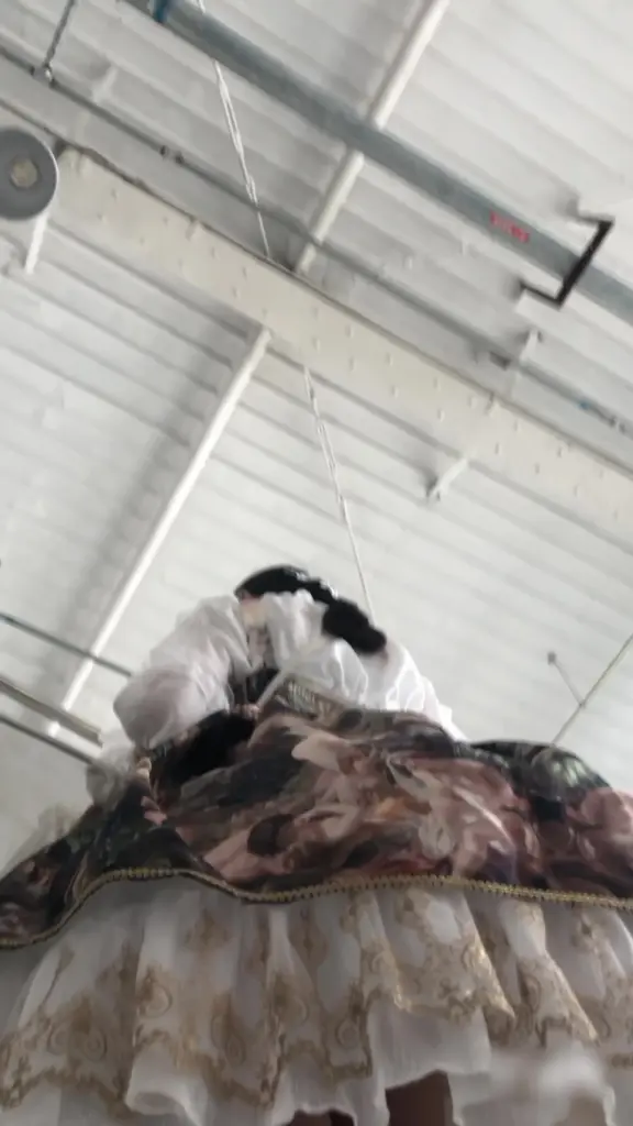 Watch Asian models posing in stockings and luxurious gold dresses at an exhibition center. Intimate close-ups and soft lighting.
