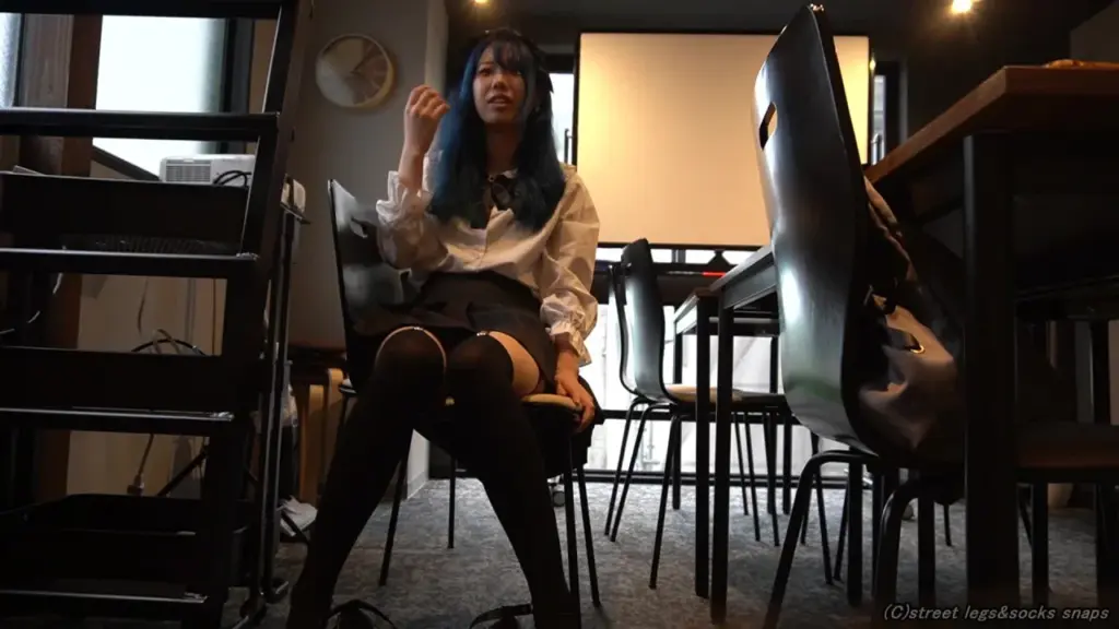 Watch an Asian office girl with blue hair and black stockings in a seductive office encounter
