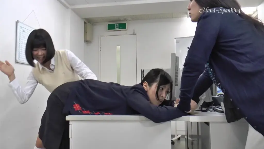 Watch three slim Asian girls in their 20s engage in a spanking session in an office setting with natural and artificial lighting