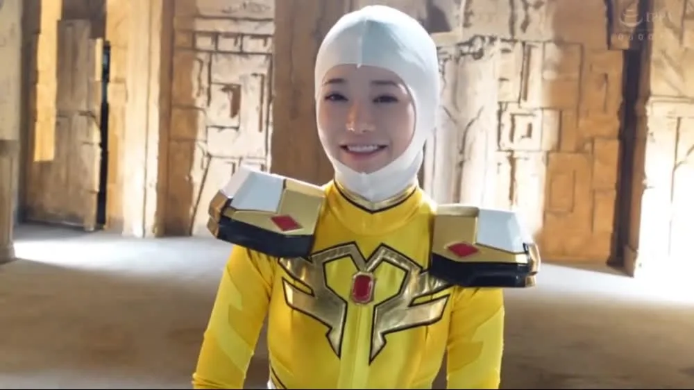 Watch an athletic Asian performer in elaborate yellow and blue costumes, posing in various indoor settings, from studio to ancient structures.