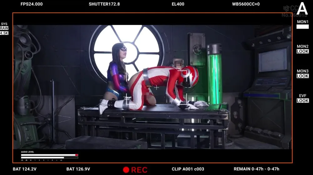 Watch an Asian performer in a futuristic setting, wearing a mask and bodysuit, engaging in intimate acts with a male partner.