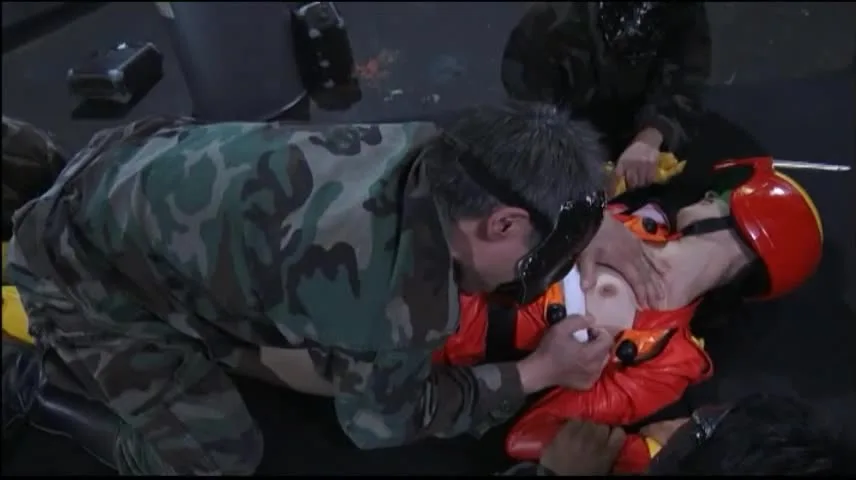 Watch intense Asian performers in camouflage uniforms and red costume engaging in explicit acts in an industrial setting.
