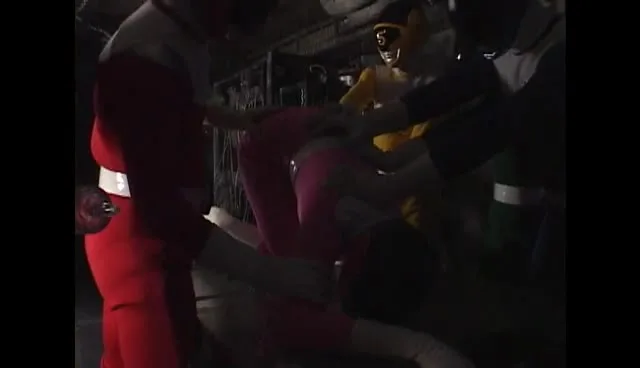 Watch Asian performers in colorful costumes interacting and restraining each other in a dark room setting