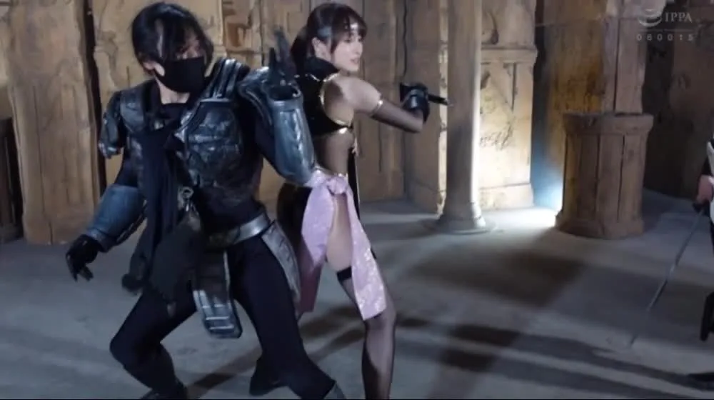 Watch Asian performers in their 20s engage in erotic poses with props like masks, swords, and lingerie in an ancient temple setting.