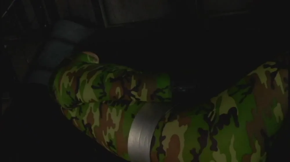 Watch a slim Asian woman pose in a pink ranger costume and green camouflage pants in a dark room with dim lighting