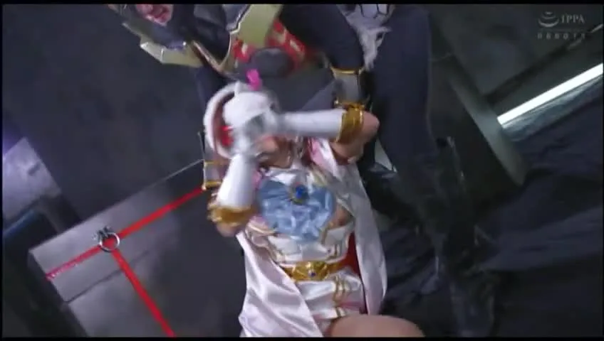 Watch an Asian redhead in a white and gold bondage costume being restrained and touched in a dark indoor setting