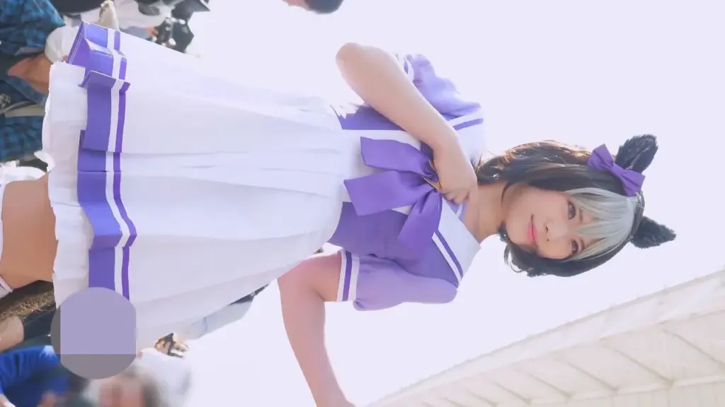 Watch an Asian performer in a purple and white sailor costume tease outdoors with white thigh-high stockings.