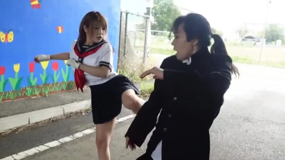 Watch steamy interactions between Asian performers in sailor outfits, featuring kicking and posing in various outdoor settings