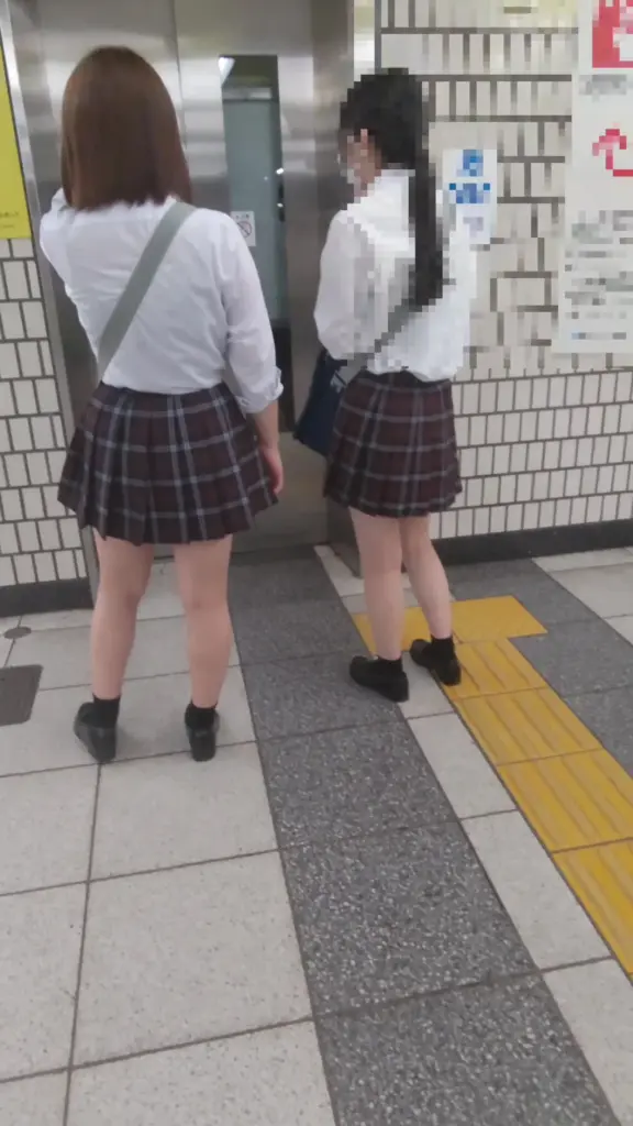 Watch Asian teen schoolgirls in revealing uniforms exploring a subway station, captured in POV and medium shots under fluorescent lighting.