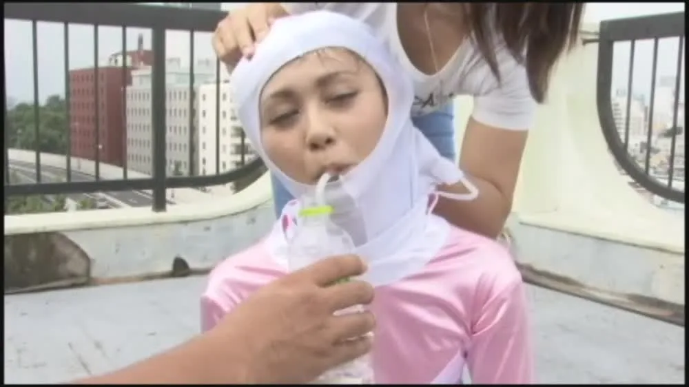 Watch Asian performers in pink superhero costumes engage in erotic scenes on a rooftop with a cityscape backdrop.