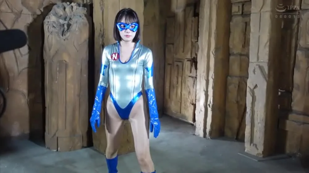 Explore a world of fantasy with an Asian performer in a silver and blue superhero costume in ancient temple settings