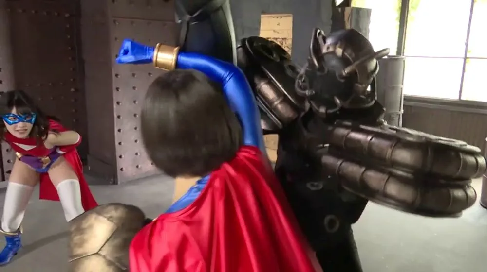 Watch Asian superheroes in costumes battle robots and construction workers in an industrial setting with dim lighting and metal doors.