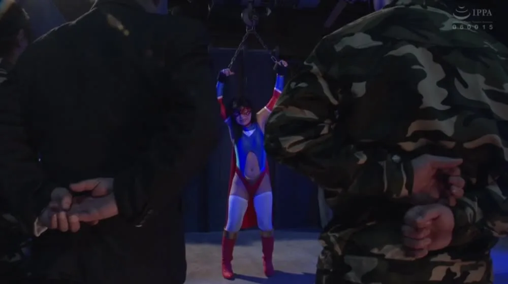 Watch Asian woman in red and blue costume being held captive by men in suits and masks, in a dramatic and intense scene