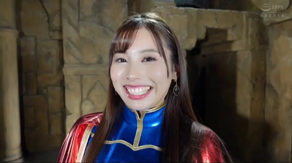 Watch an Asian woman dressed as a superhero, engaging in various poses and settings, including a stone building and outdoor locations.