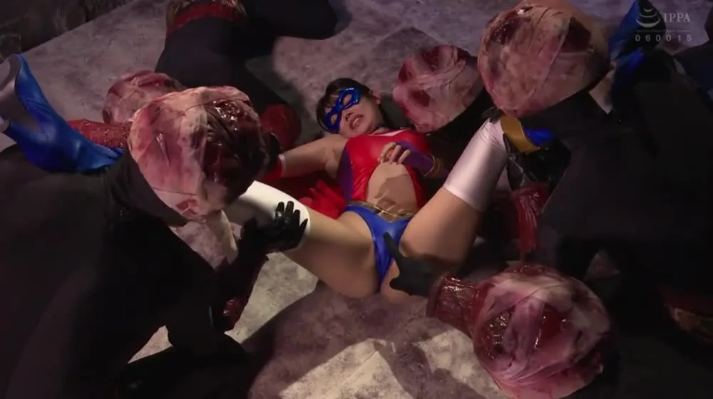 Watch an Asian woman dressed as a superheroine being restrained and grabbed in a dark room and control room setting